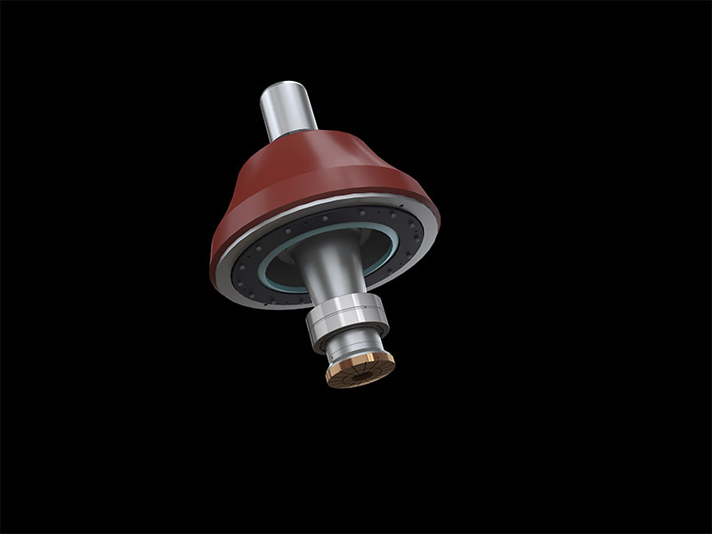 RC系列單缸液壓圓錐式破碎機工作過程中,電動機通過傳動裝置帶動偏心套旋轉(zhuǎn),動錐在偏心軸套的迫動下做旋轉(zhuǎn)擺動,動錐靠近定錐的區(qū)段即成為破碎腔,物料受到動錐和定錐的多次擠壓和撞擊而破碎。動錐離開該區(qū)段時,該處已破碎至要求粒度的物料在自身重力作用下下落,從錐底排出。排料口的大小需要靠底部一個液壓缸的升降來調(diào)節(jié)。